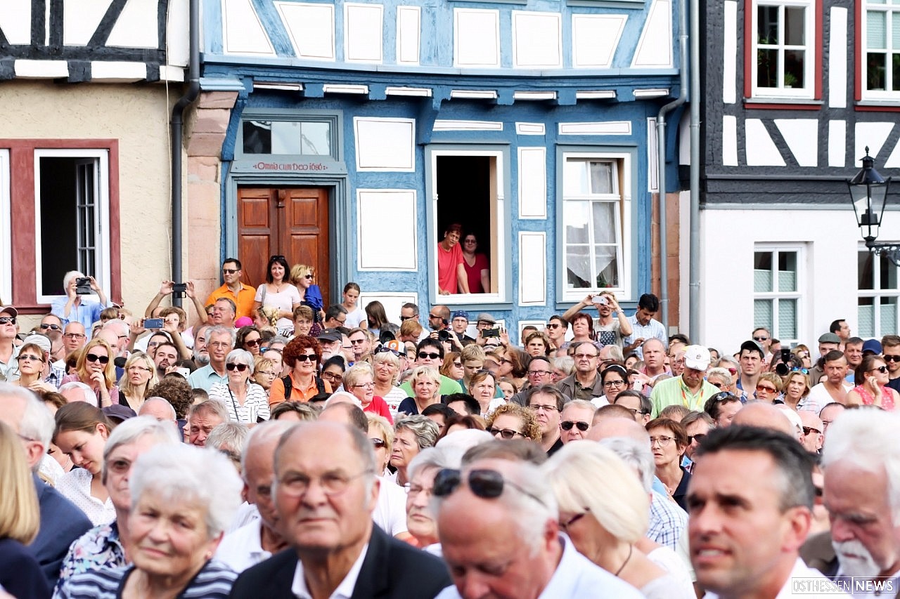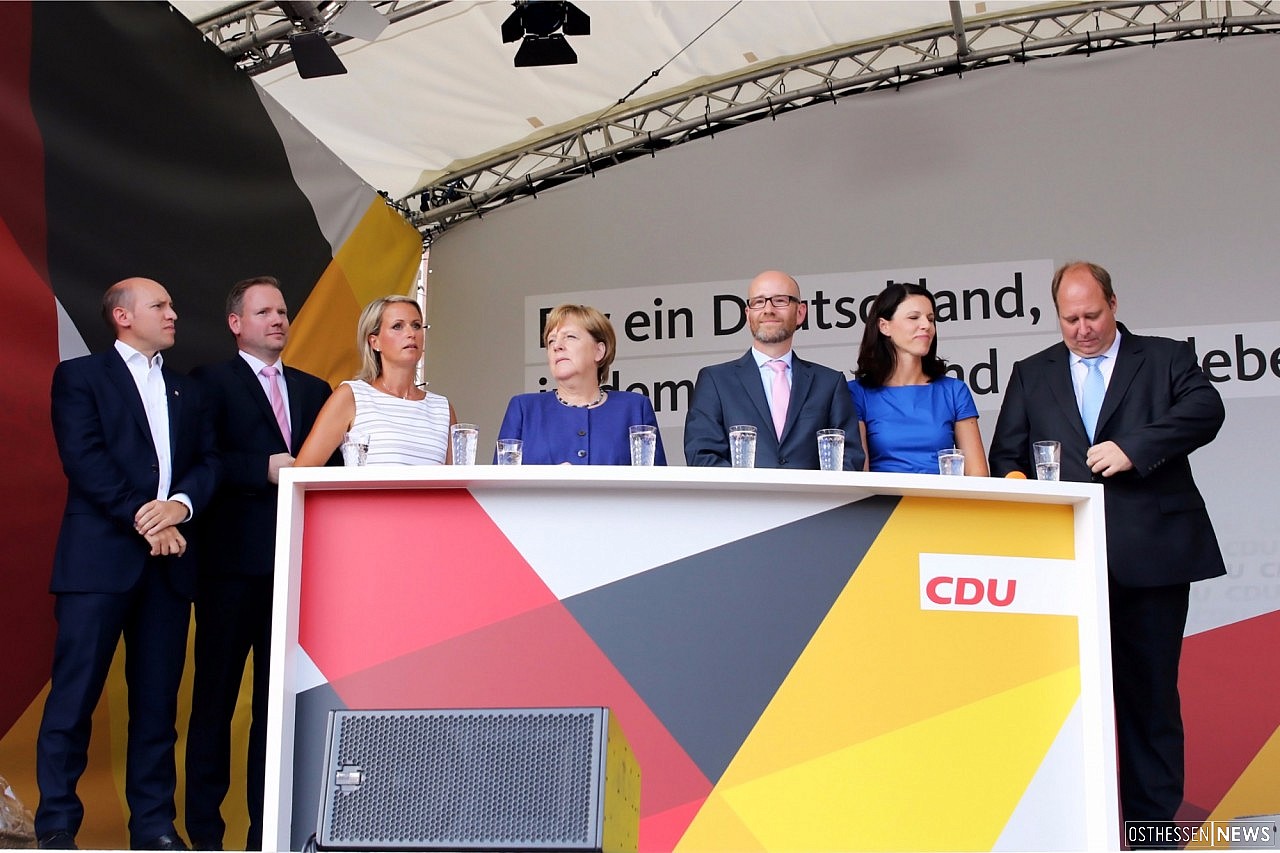 16:45 Uhr landete der Helikopter auf dem Flugplatz vor den Toren der Stadt. Mit Polizeigeleit und zwei Limousinen wurde Merkel zum Rathaus gefahren. Kurz nach 17 Uhr war es soweit: Die Kanzlerin bahnte sich mit Peter Tauber und Katja Leikert sowie Hessens Ministerpräsidenten Volker Bouffier einen Weg durch die Menge.